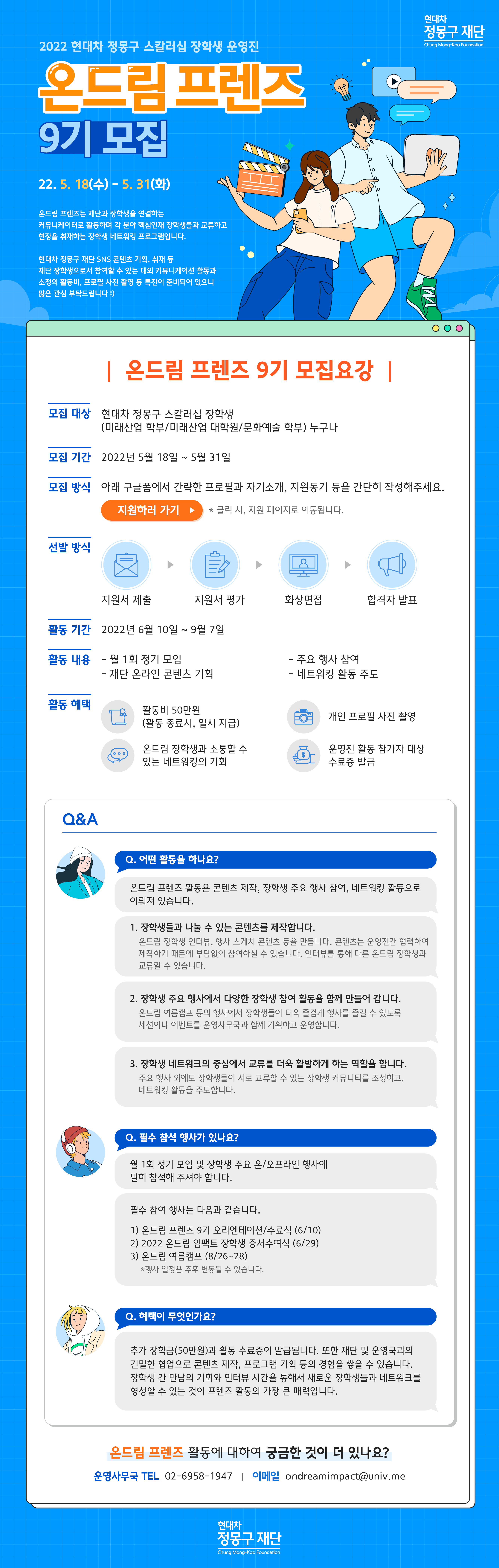 | 현대차 정몽구 스칼러십 장학생 운영진 "온드림프렌즈" 9기 모집 (~5월 31일) |