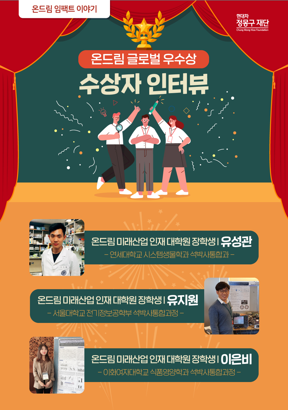 여기까지 글로벌 우수 수상자들과 인터뷰를 해보았습니다. 한국 뿐만 아니라 해외에서까지 빛을 발하는 장학생들을 보니 자랑스럽네요. 아직 빛을 발하지 못하는 장학생들의 노력이 있다는 것을 알기에 현대차 정몽구 재단, 온드림프렌즈는 계속해서 여러분의 이야기를 적어나가겠습니다. 감사합니다.